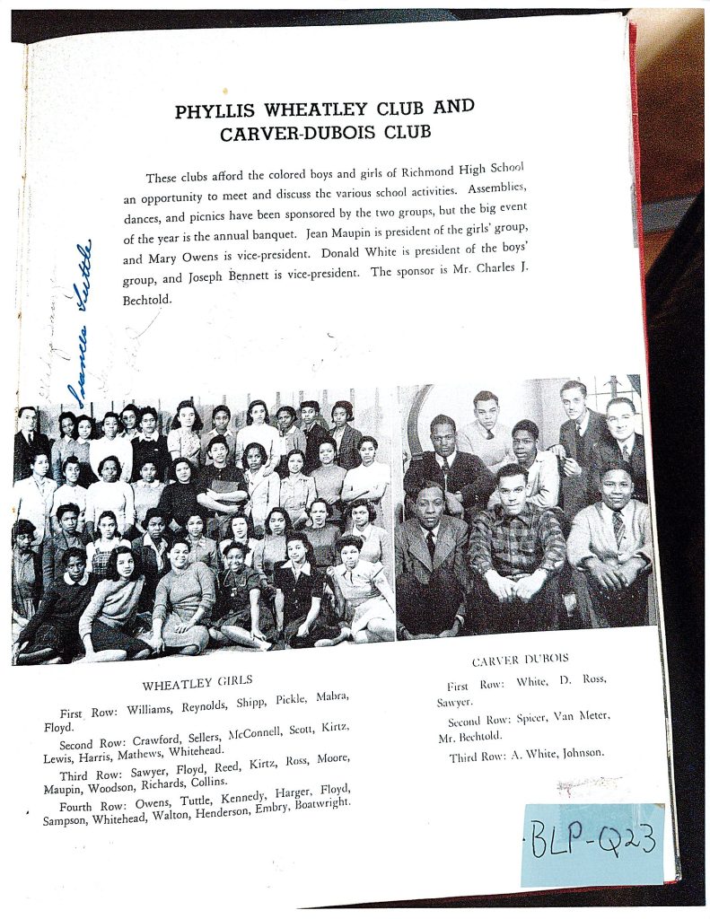 Two clubs for African-American students were started in the 1940’s – the Wheatley Girls and the Carver Dubois. These clubs